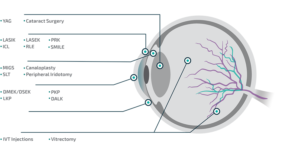 DALK=deep anterior lamellar keratoplasty; DMEK=Descemet’s membrane endothelial keratoplasty; DSEK=Descemet stripping endothelial keratoplasty; ICL=implantable collamer lens; IVT=intravitreal; LASEK=laser-assisted subepithelial keratectomy; LASIK=laser-assisted in situ keratomileusis; LKP=lamellar keratoplasty; MIGS=minimally invasive glaucoma surgery; PKP=penetrating keratoplasty; PRK=photorefractive keratectomy; RLE=refractive lens exchange; SLT=selective laser trabeculoplasty; SMILE=small incision lenticule extraction; YAG= yttrium aluminum garnet.